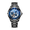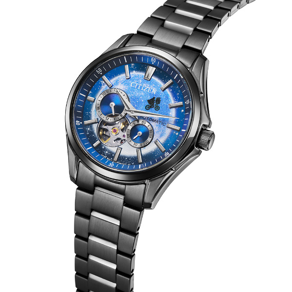 ダークグレーのケースとブルーの文字板を合わせたスタイリッシュな配色。深いブルーの見返しリングが夜空のイメージをきわだたせています。