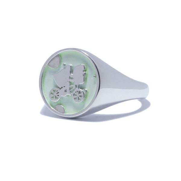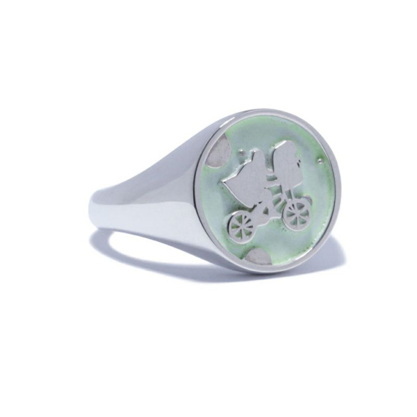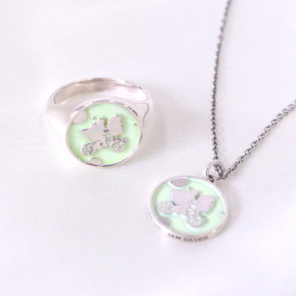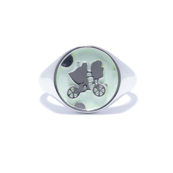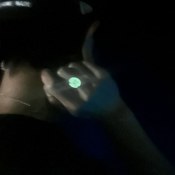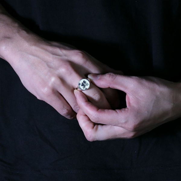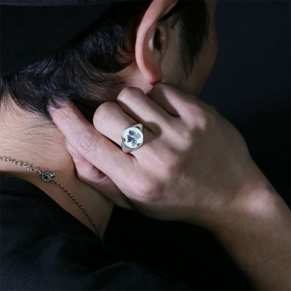 シルバー925の指輪は、蓄光塗料のギミックを仕込み、裏面にタイトルロゴを彫刻し、コンセプトとユーモアを潜ませています。