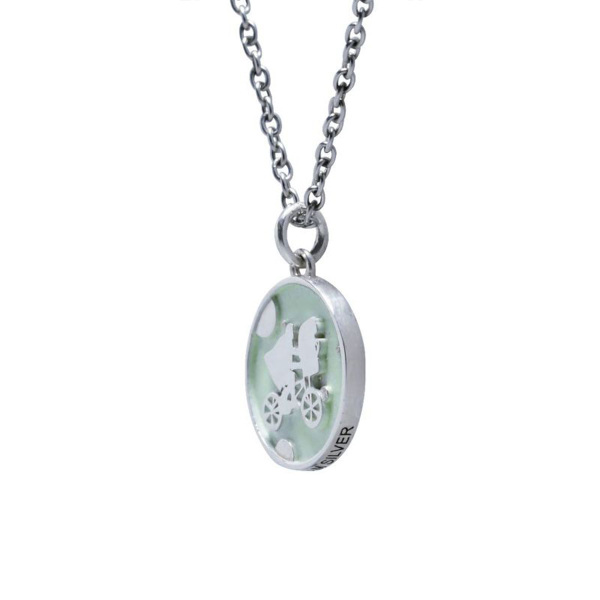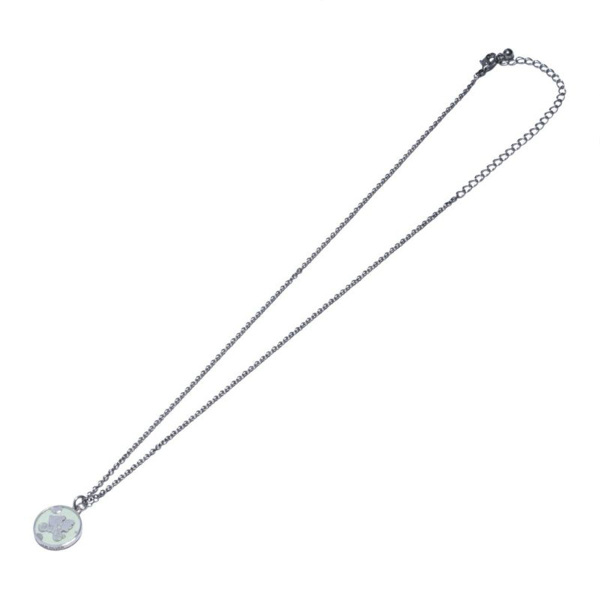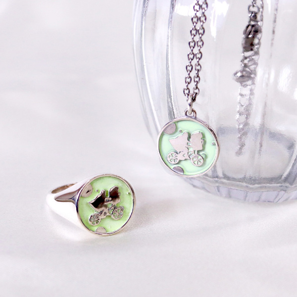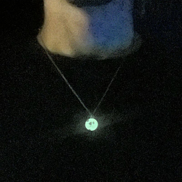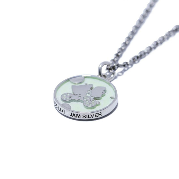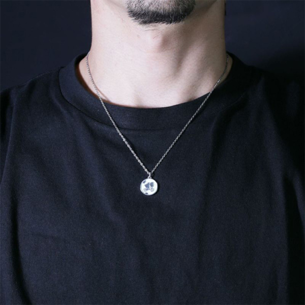 シルバー925のネックレスは、蓄光塗料のギミックを仕込み、裏面にタイトルロゴを彫刻し、コンセプトとユーモアを潜ませています。