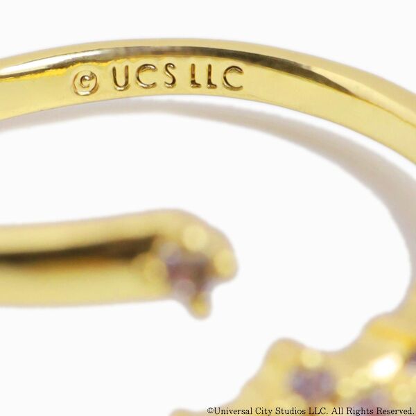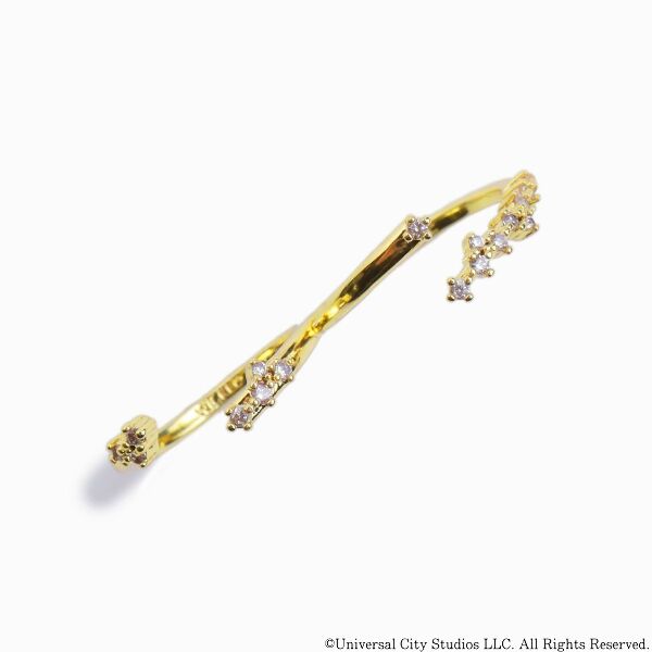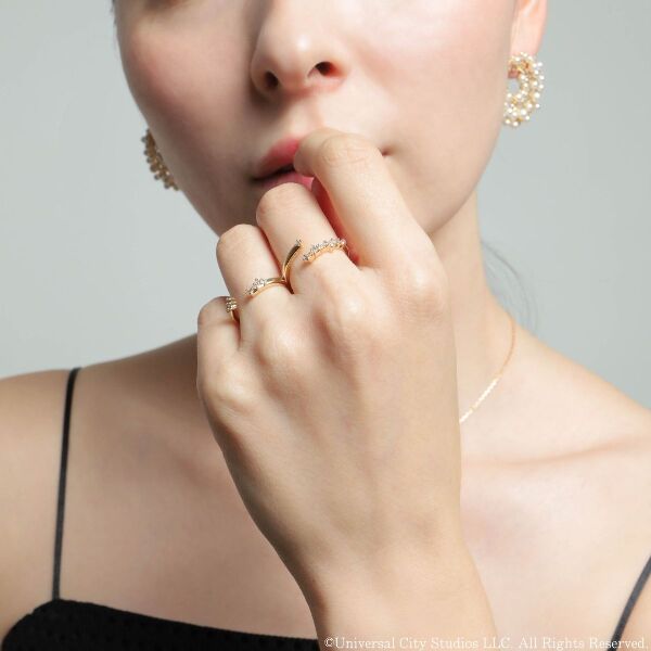 2本の指にまたがる立体的なデザインは、ゴールドカラーの地金と相まって洗練された印象に。