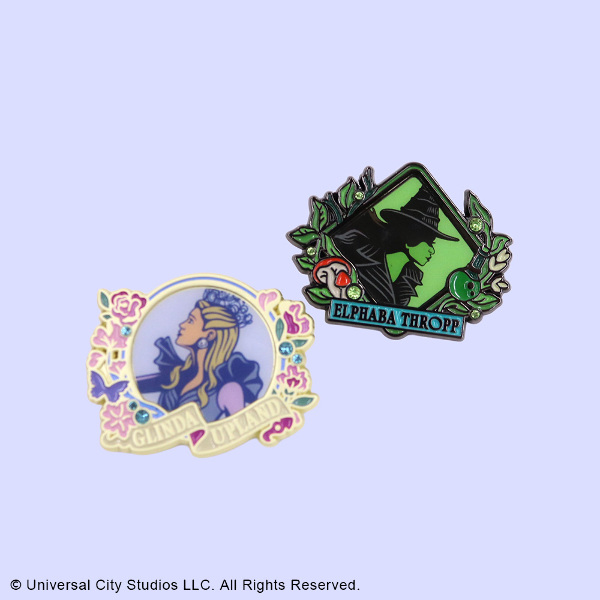 映画『ウィキッド 永遠の約束』の公開を記念して、新商品が登場! 「エルファバ」と「グリンダ」のイラスト風アートを使用したピンズセット。 繊細なデザインと、キラキラのラインストーンが目を惹きます。