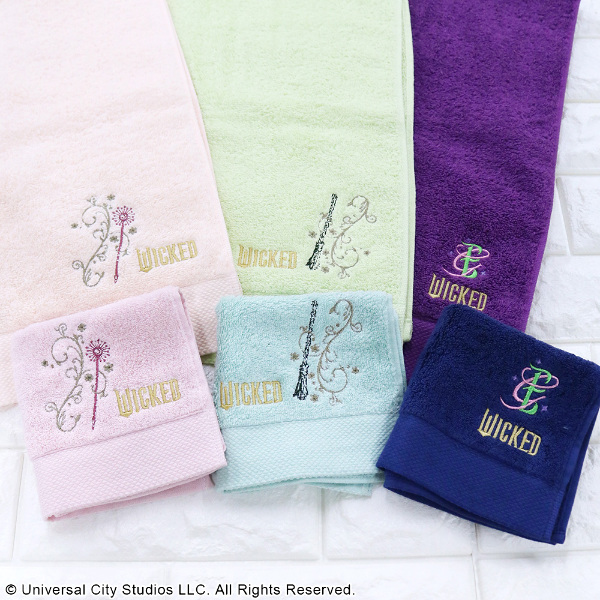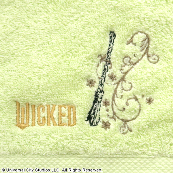 草花の飾りとほうき・バブルワンドが対になったいて、二人の関係性を表現するようなデザイン。 タオルカラーは「エルファバ」を象徴するグリーン系の配色展開。