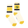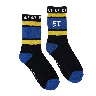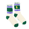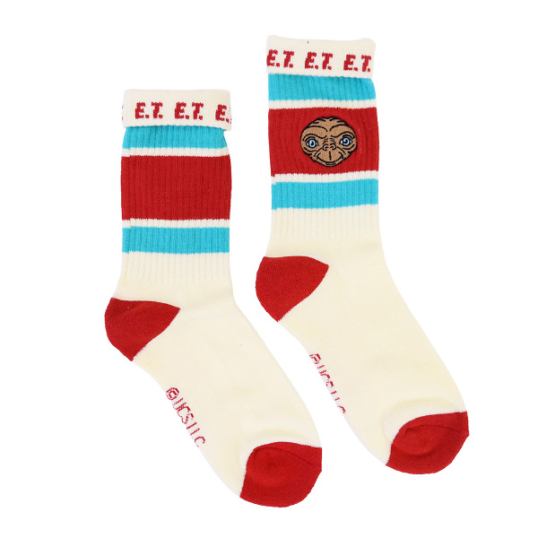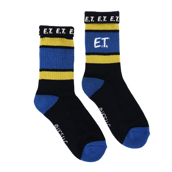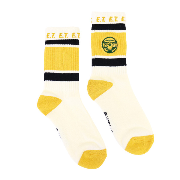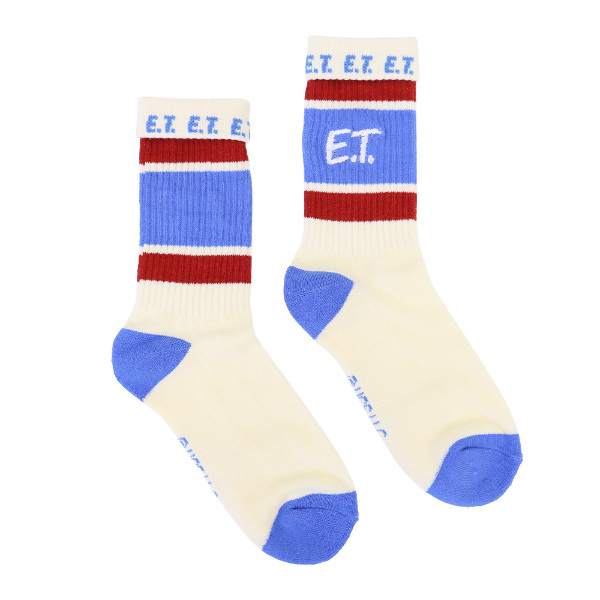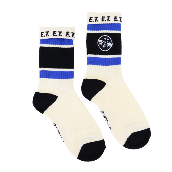 刺繍とボーダーの模様がかわいいクルーソックスです。履き口の裏にロゴや文字が入っているので、折り返して履いてもおしゃれです! 足底はパイルになっています。