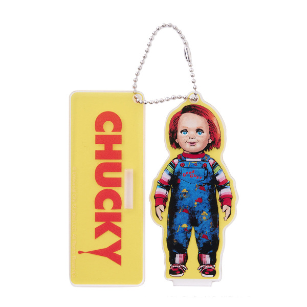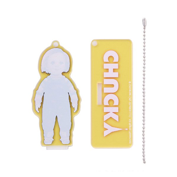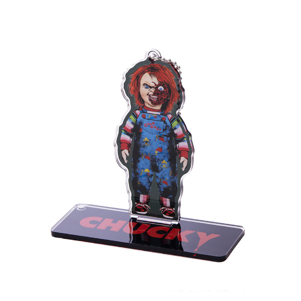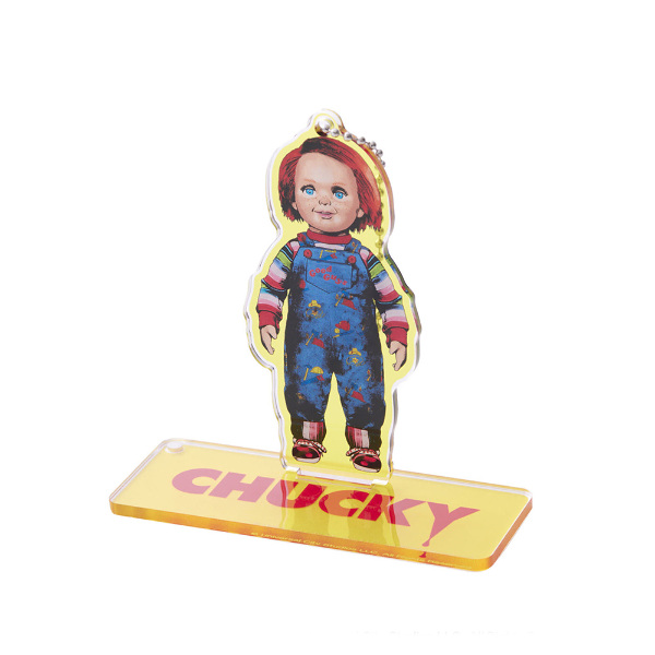 ダイカットのキャラクターと台座プレートがセットになったアクリルキーホルダー。